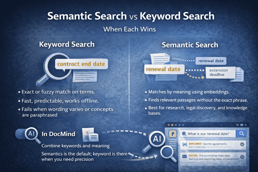 Keyword search is great when you know the exact term. Semantic search shines when you care about *meaning*—finding “renewal date” even when the doc says “contract end date.” This post breaks down the tradeoffs and when to use each, especially inside a MindParse AI workspace.